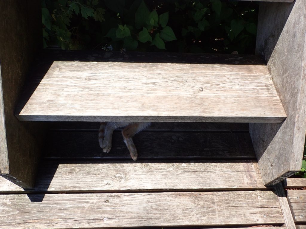 ランチのお客様のためにウッドデッキで準備をしていましたら、こんなところからチャイの足がのぞいていました。。