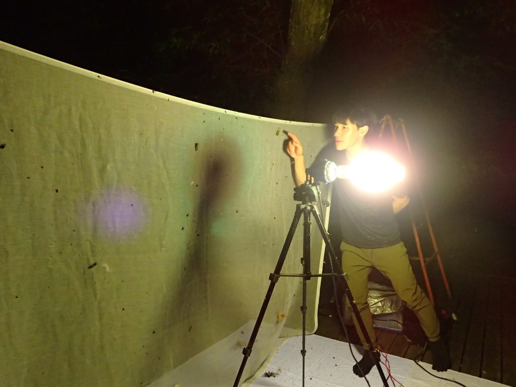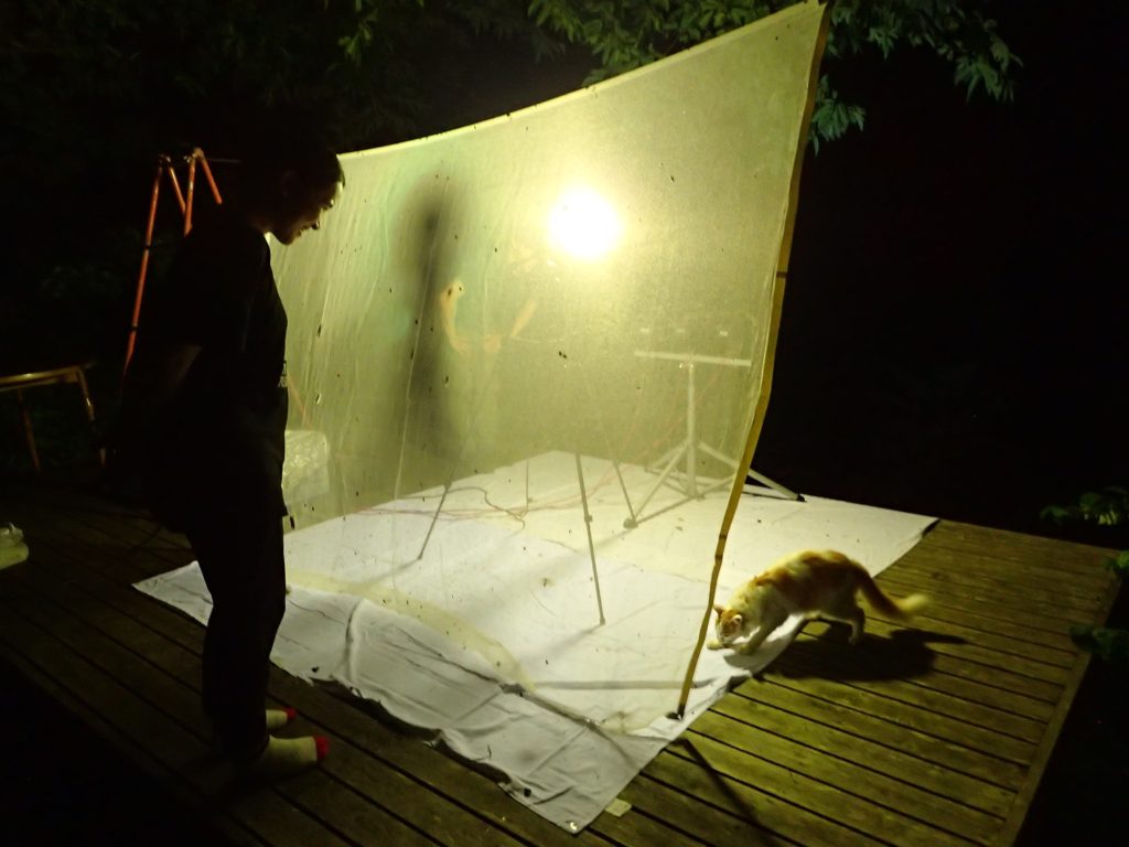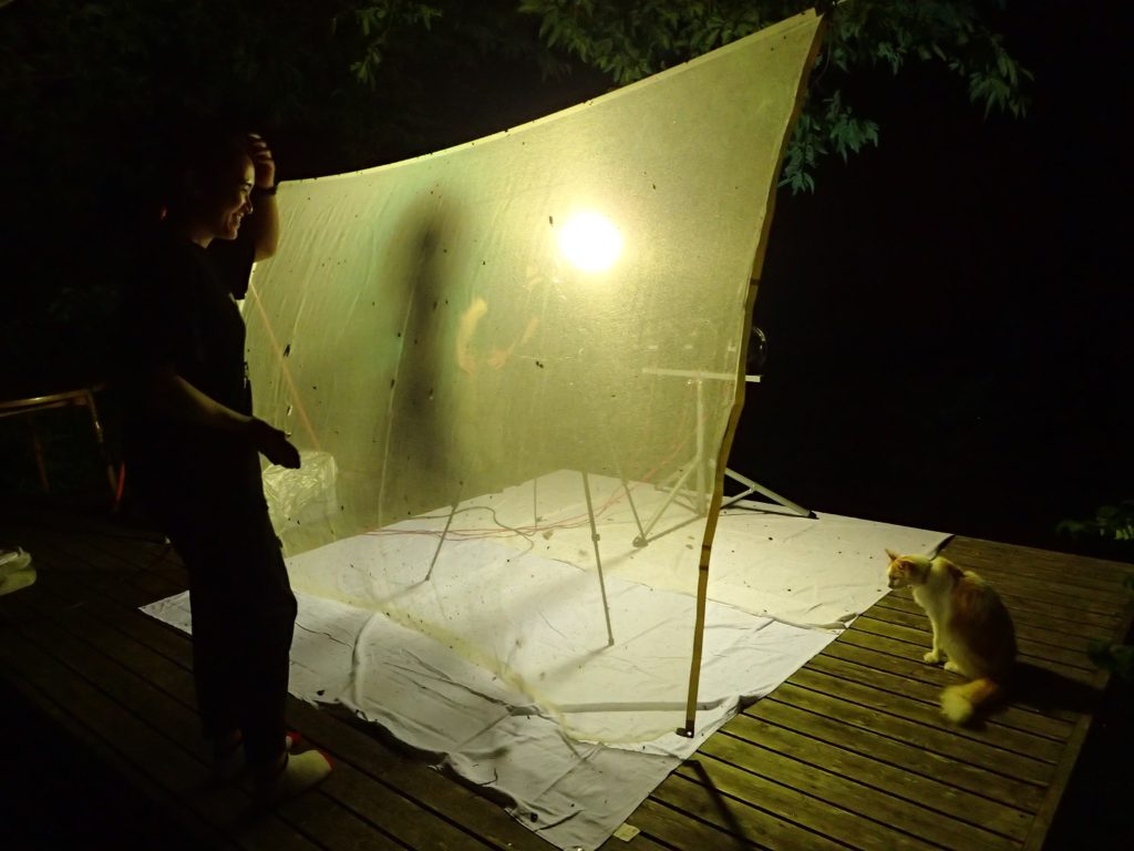 この後、夜が更けるにつれて蛾や甲虫たちがわんさと集まってきたのですが、初ライトトラップでも動じない、虫めづる姫でした!(^^)