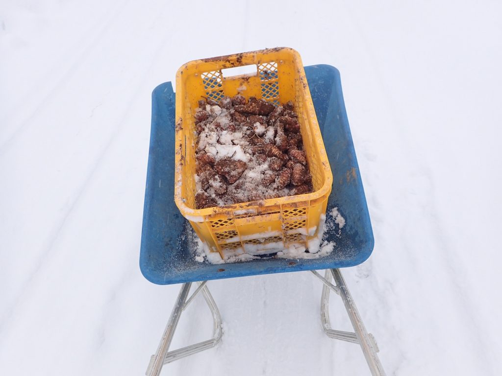 「そうだ!次は、一輪車ではなくて、そりにコンテナを乗せて雪の上を引いて歩こう~!」