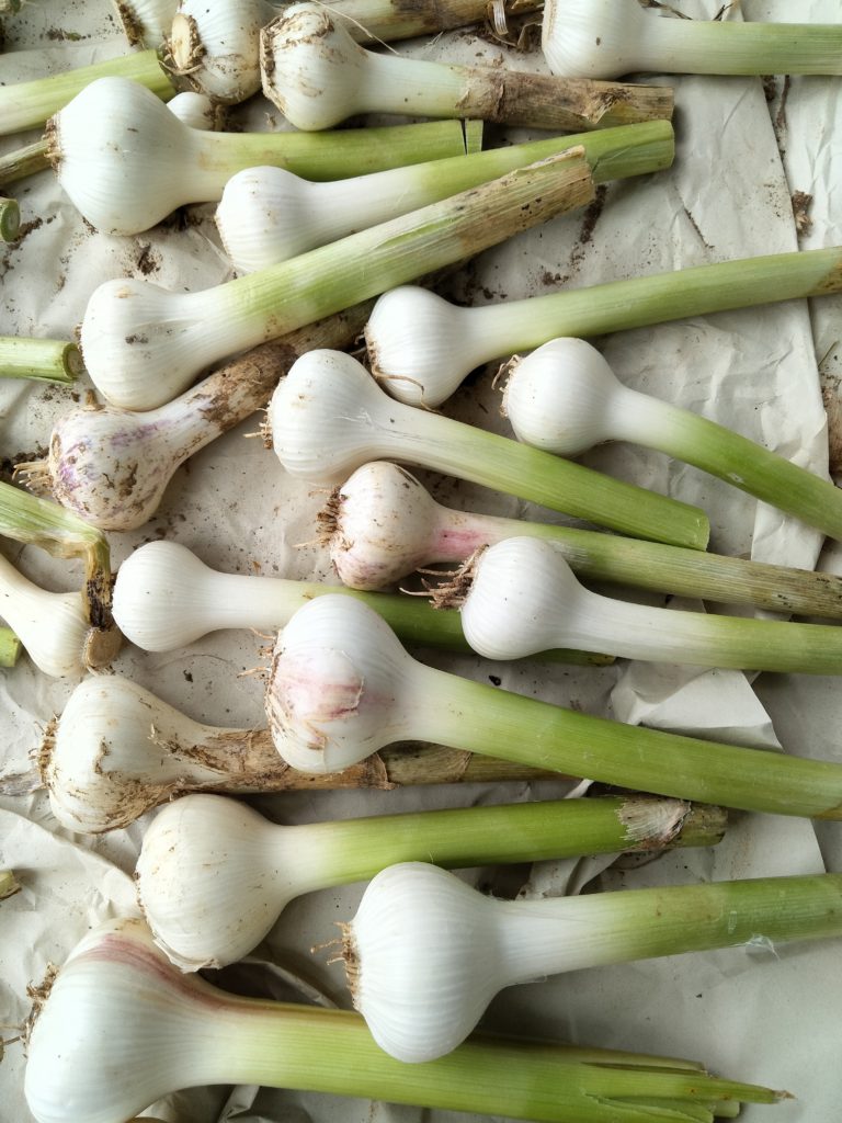 写真のニンニクは、昨日採ったものです。今日も続きを掘ろうと思いましたが、午後に雨の予報が出ていたので、延期することにしました。