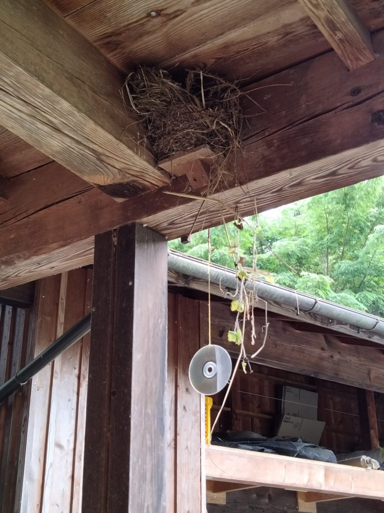 このまま、スズメに巣作りをさせようか、いや待て、農家にとって穀物を食べるスズメは害鳥で、虫を食べてくれるツバメは益鳥だぞ、、