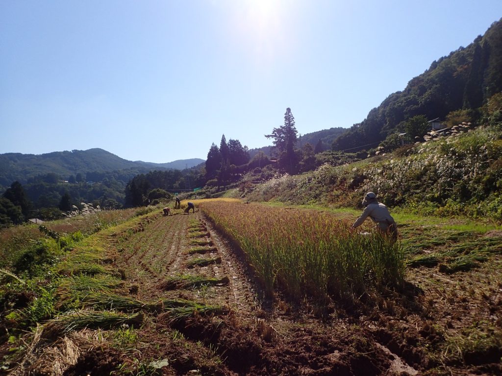 連続して襲ってきた台風で圃場が水浸しになったり、一部棚田が崩れたり、、稲刈りの日までに圃場が乾いてくれるかどうか本当に心配だったのですが、水はけをよくするためのヨケ掘りも仲間たちが手伝ってくれて、なんとか稲刈り機が動けるくらいまで土が乾いてくれました。