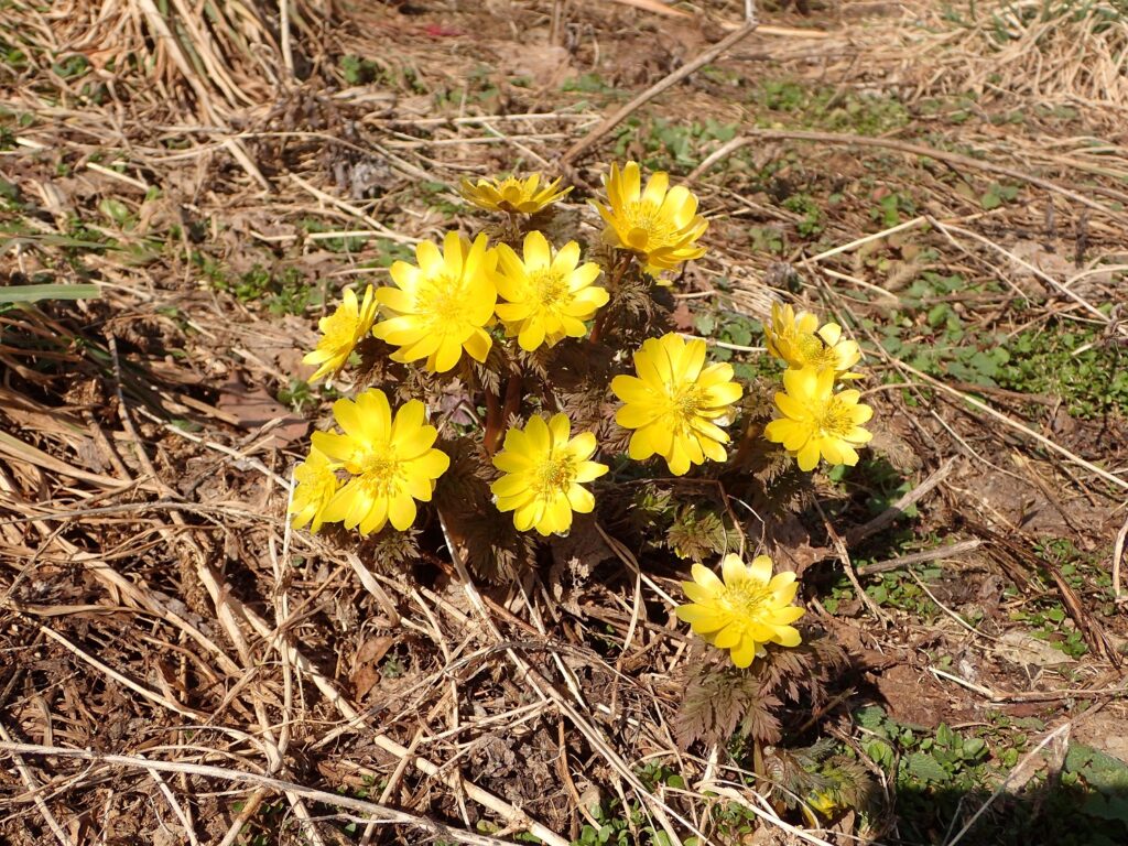 さて、写真は、今年は今が満開になっているフクジュソウの花!