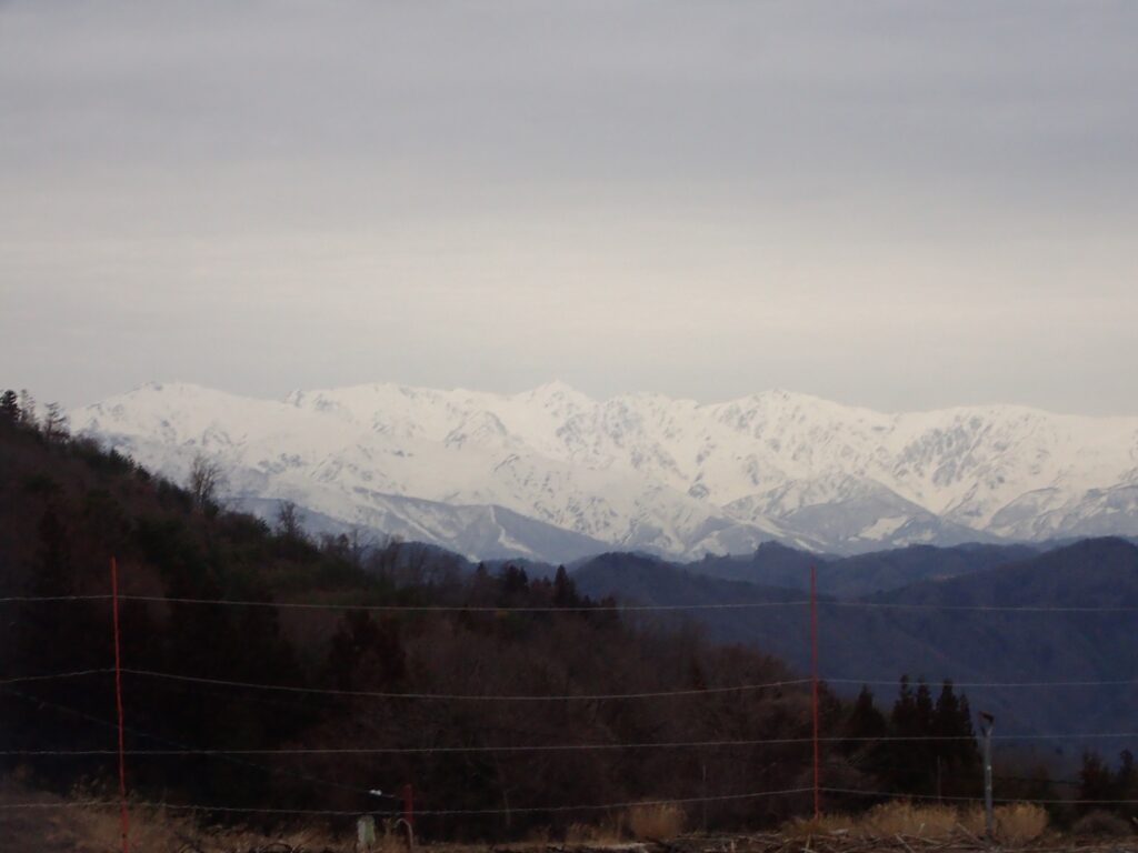 遠くに望む北アルプスは雲と靄で霞んでいます。