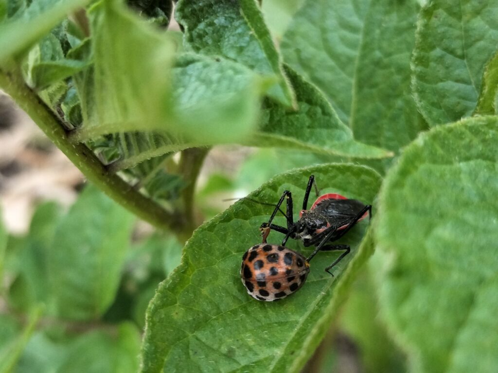 ジャガイモ畑で、害虫のニジュウヤホシテントウを退治して歩いていた時に、ニジュウヤホシテントウに長い口吻を刺して体液を吸っているカラフルな虫を見つけました!