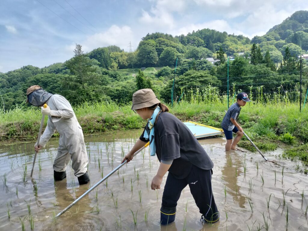 田んぼでは、山村留学の子どもたちと一緒に、夕陽を浴びながら田草取りをしました。