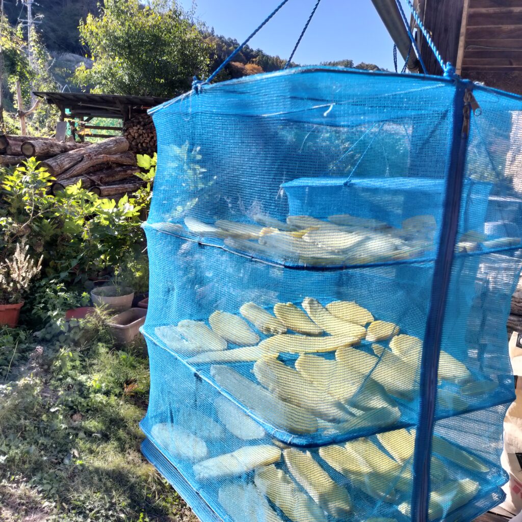 サツマイモを柔らかくなるまで蒸して、熱いうちに皮をむいて、冷めてから1センチ位の厚さに切って干します。