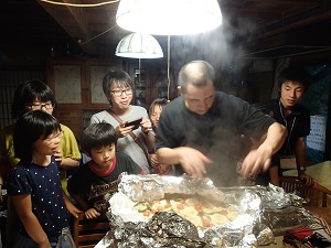 この日の明け方東京から駆けつけてくれた佐藤さんは、チャンチャン焼きの準備中。