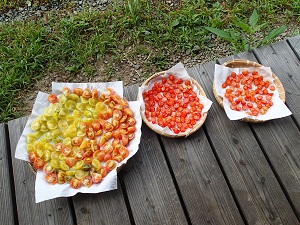 昨日から干していたセミドライ用のミニトマトなのですが、今日は小雨交じりのお天気となったために急きょオーブンで仕上げをすることにしました。