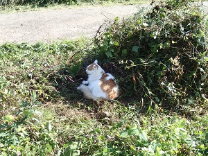 刈り取った草の山には日陰が出来、ミコ太がちゃっかり一休みです。