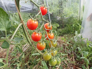 ハウスでは、ようやくミニトマトが少し色付いて来ました。。