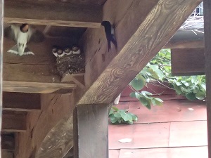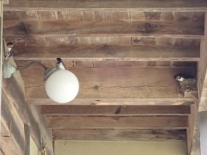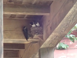 10数羽が巣の周囲をくるくると飛翔したり、飛び方のお手本を見せるかのようにホバリングをしたり、ヒナの目線に良く見えるようにと縁側を直進するように飛んでみせたり、、手の届きそうな至近距離で、こんなにたくさんのツバメを見るのは初めてのことです!
