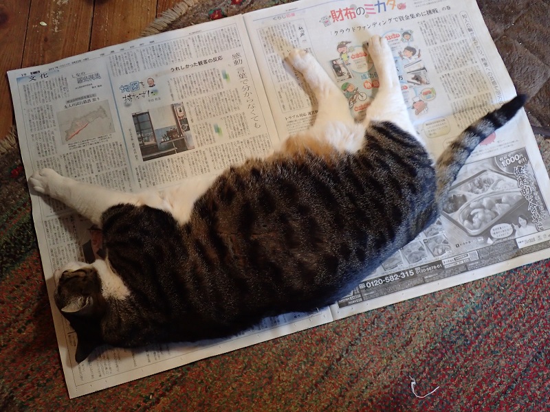 「ニャ」とチビ太の声がして、そのまま新聞紙の上にドスン、、、