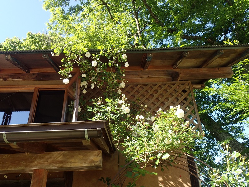農楽里ファーム母屋の前の看板の両隣と、のらcaféのお庭のバラの花が咲き始めました!