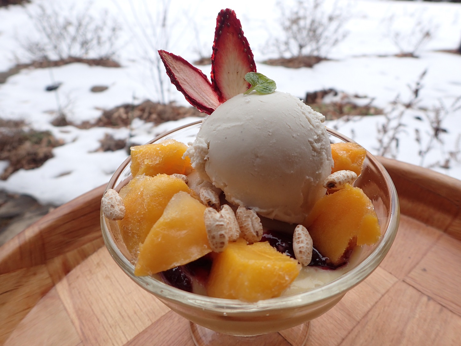 今日ご用意しましたスイーツは、お抹茶豆乳プリンと、カシューナッツの塩バニラアイスとマンゴーシャーベットのミニパフェでした。。