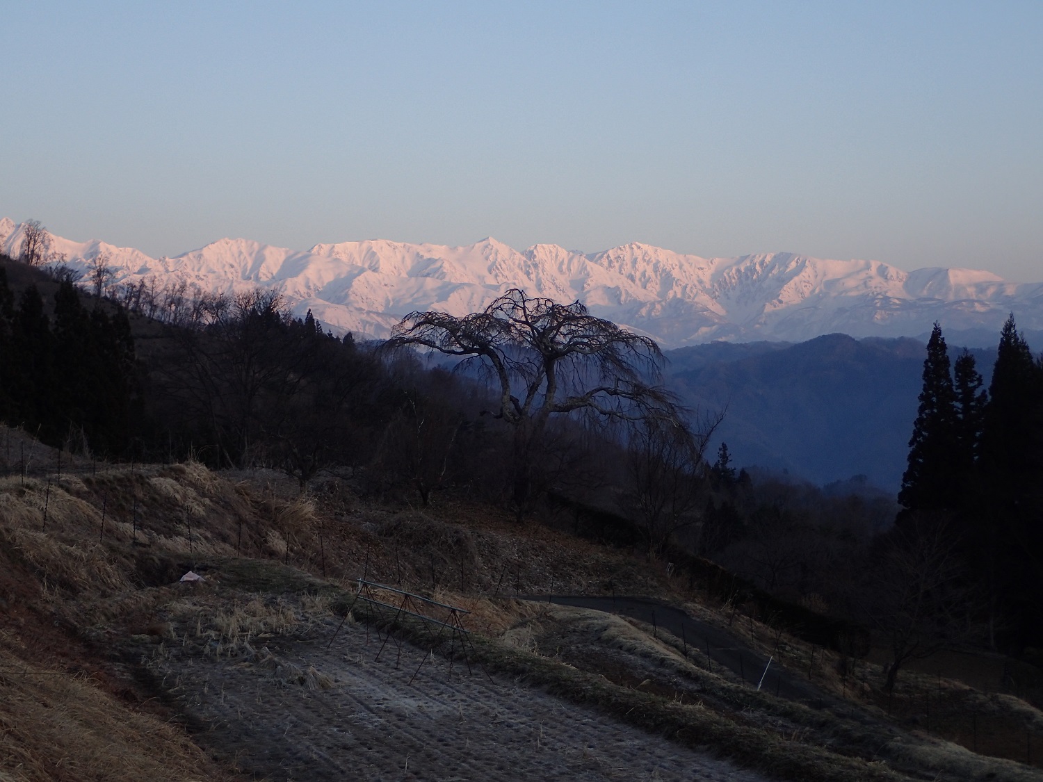 今朝は、アルプスのモルゲンロートがとても美しく、早朝から写真を撮りに集落内を歩きました。