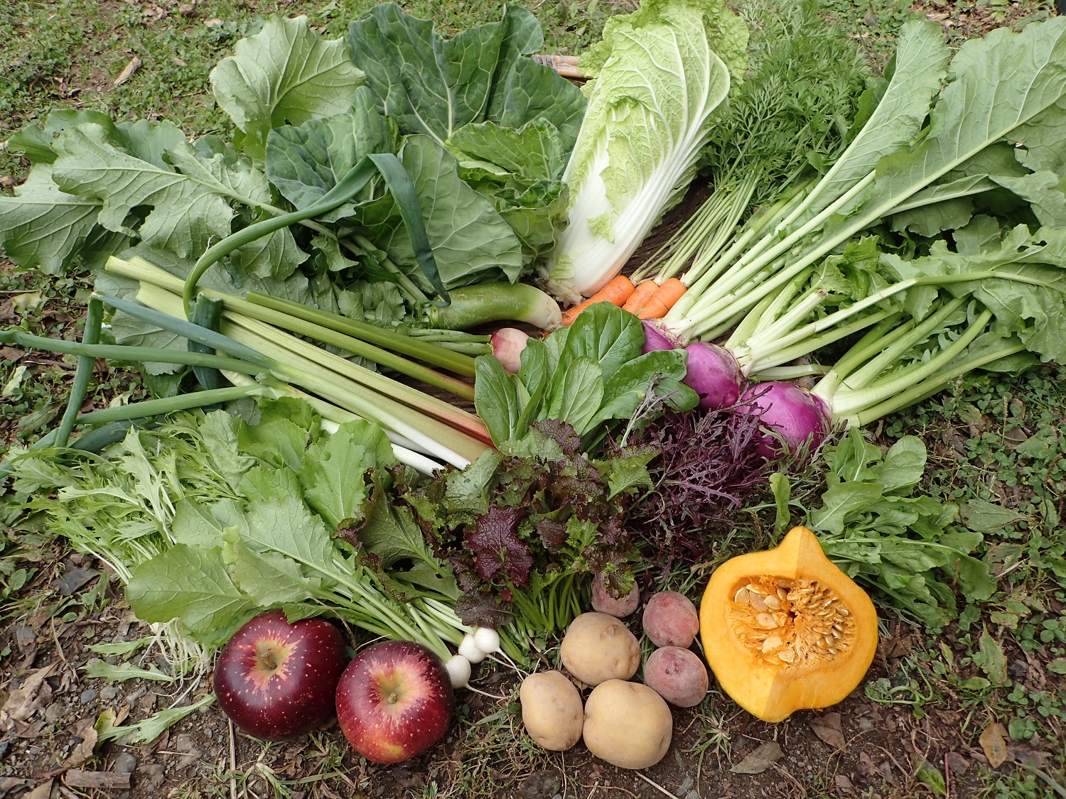 キャベツ、白菜、葉付きニンジン、青長大根、紅芯大根、木曽紫カブ、ルバーブ、小松菜、水菜、ラディッシュ、赤水菜、長ネギ、ルッコラ、カボチャ、ジャガイモ(キタアカリ、アンデスレッド)、ミヤマコカブ間引き、高菜、トクナガサンのリンゴ秋映、