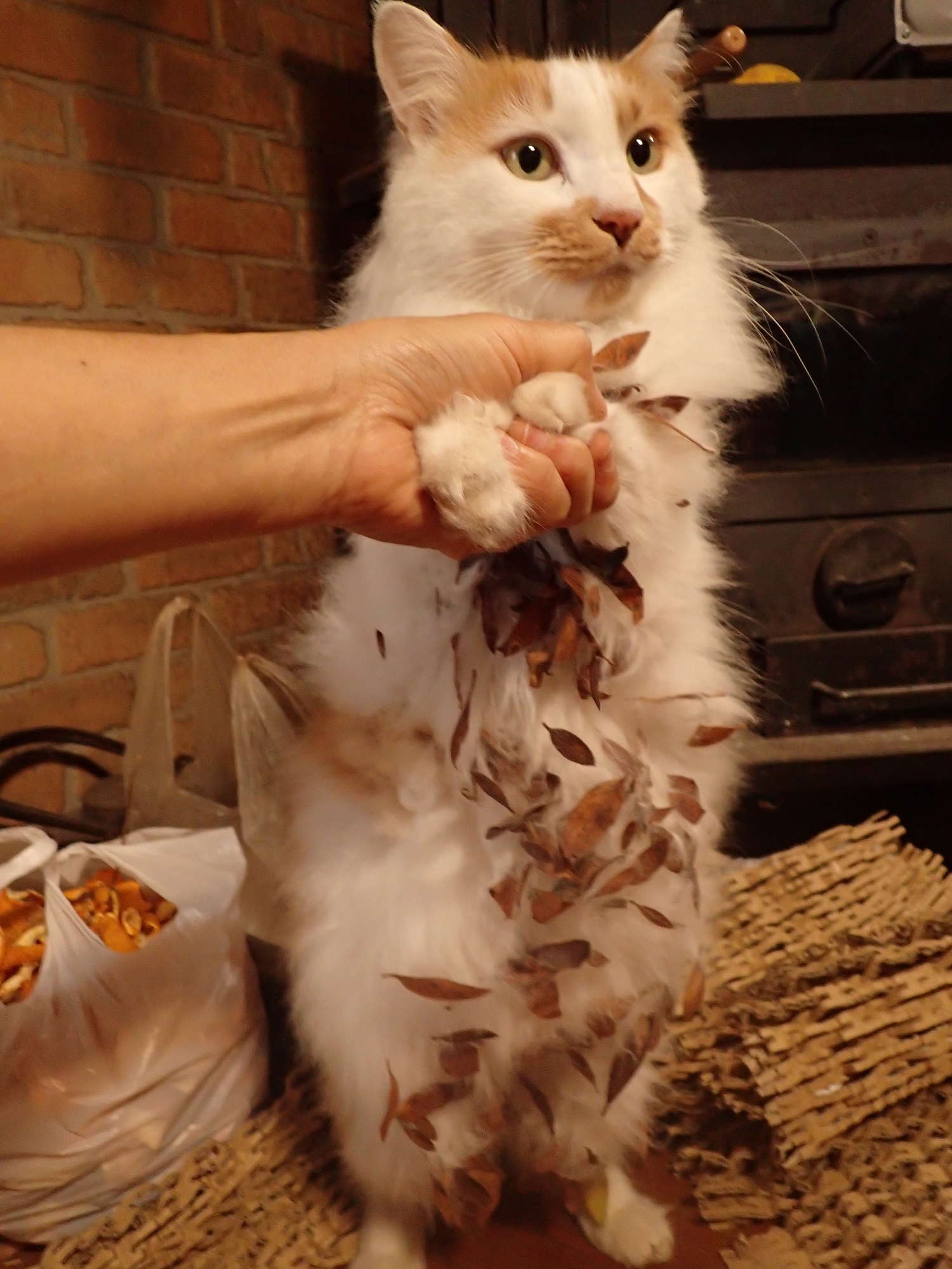 ミコ太、お帰り、、、ン?、ちょっとまた葉っぱをたくさんつけてきましたね、、