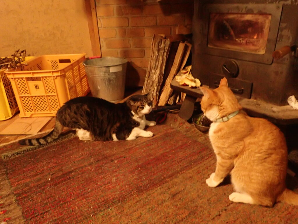 とはいえ、戦闘モードも長くは続かず、唸りながらガンを付け合って、軽く猫パンチを一発程度で、ことは収まります。。