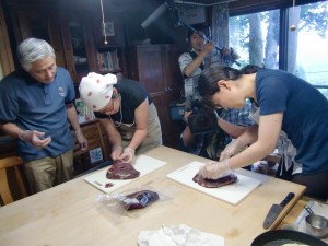 さて、獣害問題セミナー終了後は野生肉料理研究家の井上さんによります料理教室です。まずは、シカ肉の筋採りを体験。