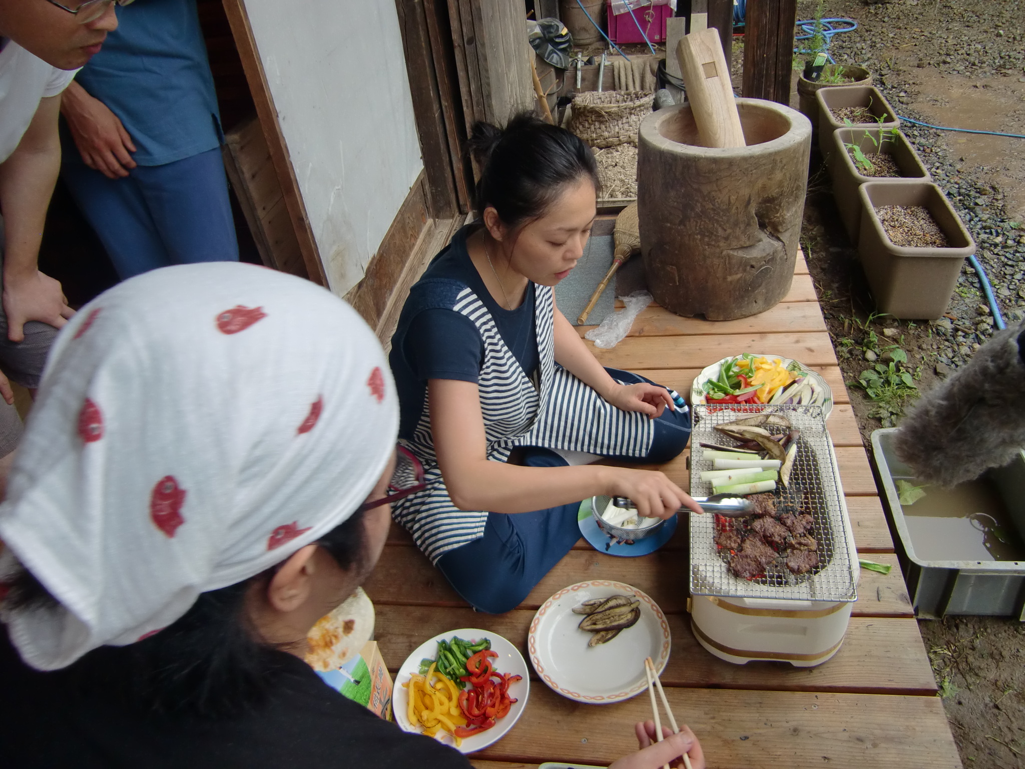 縁側では仕上がったシカ肉を炭火で焼いています。
