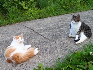 さて、、日が暮れるまで草取りをしている農楽母さんの横では、チビ太とミコ太が夕涼み。