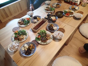 旬のお野菜のサラダに、くらかけ大豆のおからのハンバーグ、車麩のカツ、ひじき煮、大根とリンゴの梅肉和え、カボチャ煮、栗の渋皮煮、大根とナスとニンジンのぬか漬けに、野沢菜の酢醤油漬け、そして、古代米ミックスのご飯にワカメとシメジのみそ汁。
